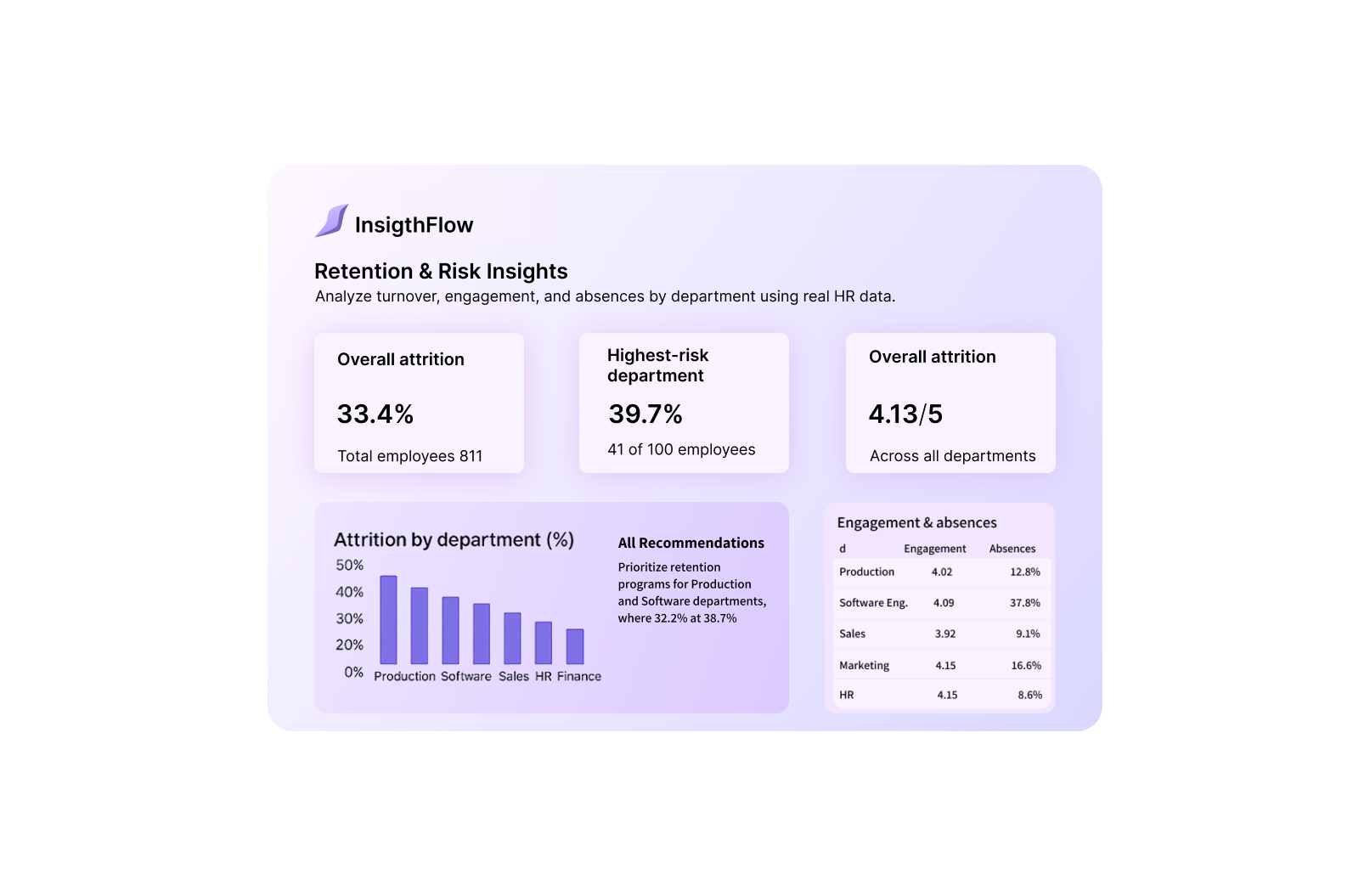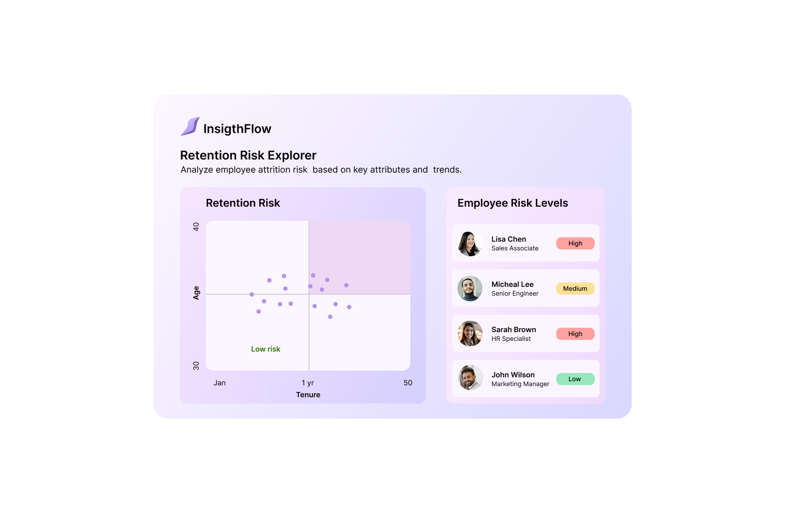 Enabled HR and leadership teams to anticipate workforce risks, prioritize retention actions, and align people strategies without relying on intrusive or individual-level monitoring.